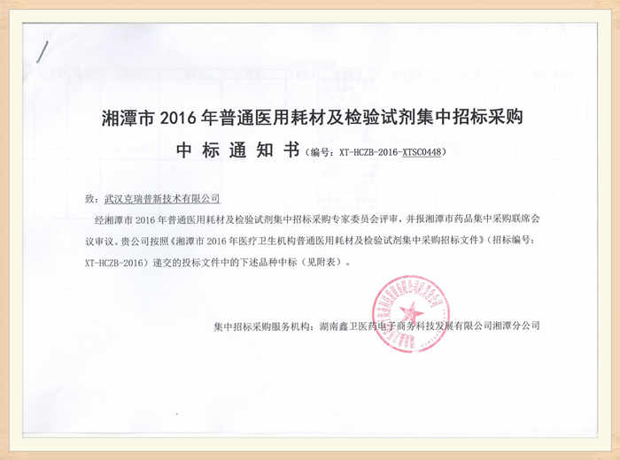 【湖南省湘潭市2016年普通醫(yī)用耗材及檢驗劑集中招標(biāo)采購中標(biāo)通知書】經(jīng)湘潭市2016年醫(yī)用耗材招標(biāo)采購中經(jīng)專家評審,并報湘潭市藥品集中采購聯(lián)席會審議我們武漢克瑞普新技術(shù)有限公司已經(jīng)成功中標(biāo),中標(biāo)的產(chǎn)品是胸腔固定夾板(A1型)已在多家醫(yī)院臨床使用使用反應(yīng)良好。