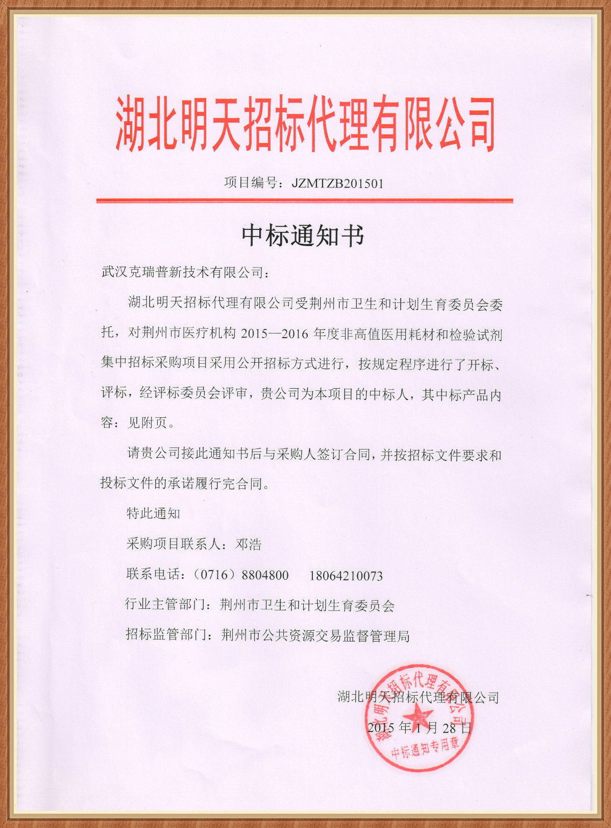 【湖北省荊州市2015-2016年度非高值醫(yī)用耗材和檢驗試劑集中招標采購中標通知書】武漢克瑞普新技術(shù)有限公司在荊州市醫(yī)療機構(gòu)非高值醫(yī)用耗材和檢驗試劑集中招標采購項目中我司經(jīng)評標委員會的評審決定成功獲得了中標的資格,我們本次中標的產(chǎn)品是我廠家較為關(guān)注的一款產(chǎn)品那就是我們的東科圣康品牌的胸腔固定夾板產(chǎn)品,這款產(chǎn)品在醫(yī)院以臨床使用中較為良好,我們歡迎各大經(jīng)銷商與我們?nèi)〉煤献鳌?/span>